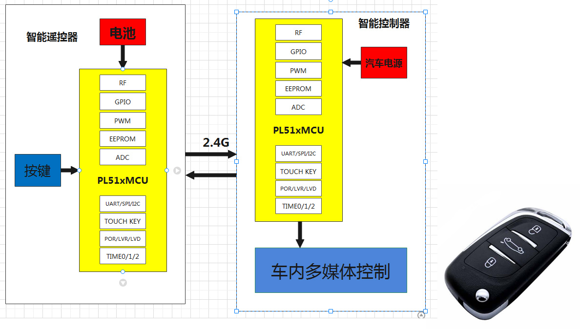 当前汽车用户越来越多,汽车电子发展迅速,车内多媒体控制繁琐多样,使用PL51WT020设计的汽车遥控器,很好地解决车内多媒体等功能无线控制,遥控器做成随意贴方式,可以安装在车内任意位置,不受方向障碍物等影响控制效果。